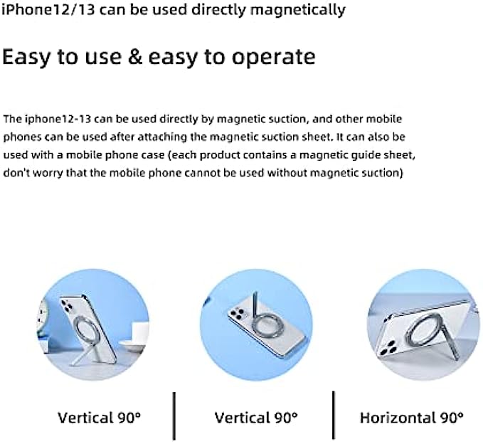 • Lightweight and strong magnetic. Made of high quality aluminum alloy with built-in strong magnet. So it can stick tightly to your iPhone 13/12 series. Please note (long-term direct magnetic attraction of the mobile phone may wear the surface of the mobile phone: 1. It is recommended to use it with a magnetic mobile phone case 2. It is recommended to use it with a magnetic suction sheet)