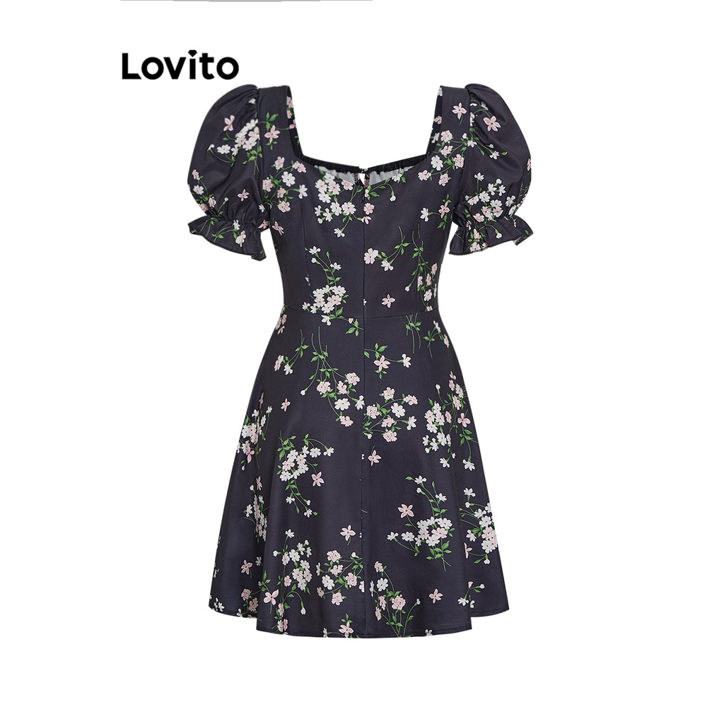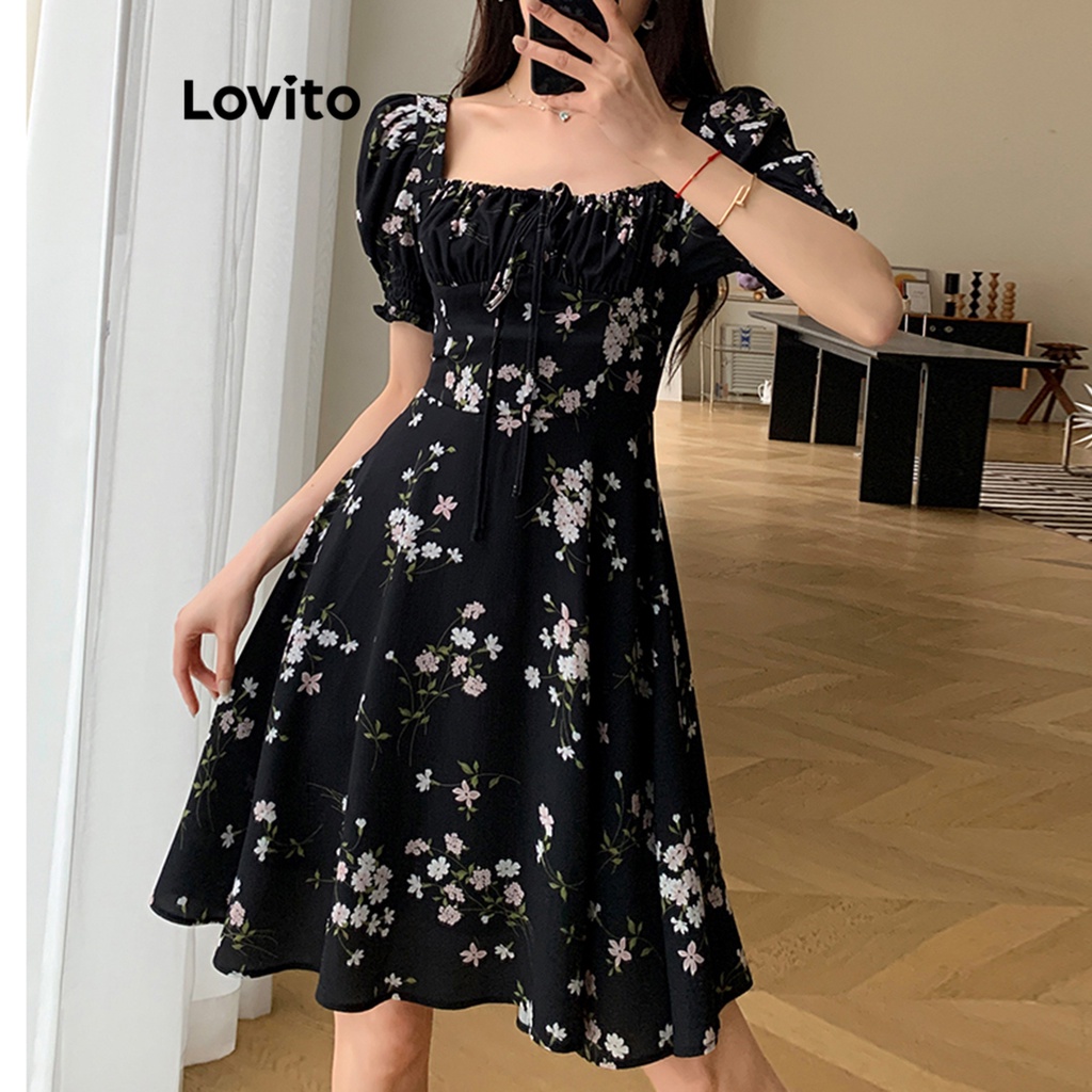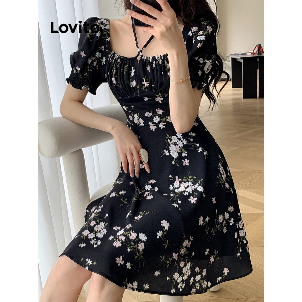 Lovito Casual Ditsy Floral Lace Up Dress for Women L68ED190 (Black)