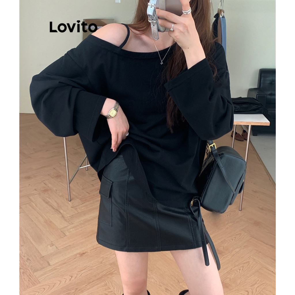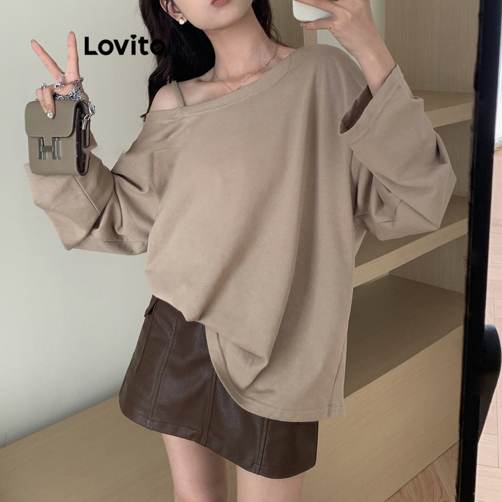 Lovito Casual Plain Asymmetrical T-Shirt for Women LNE24059 (Khaki/Dark Grey/Grey/White/Black)